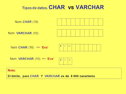 El tipo de dato VARCHAR almacena series de caracteres de hasta 255 bytes en un campo de longitud variable los datos pueden consistir en letras, números y símbolos CHARACTER VARYING se maneja exactamente igual que el tipo de datos VARCHAR